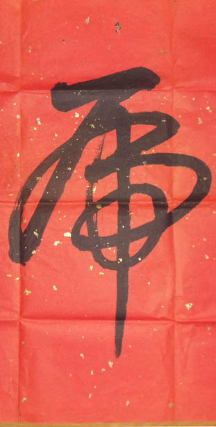 2005年4月初的一天傍晚,刘老师的侄女出现上述症状,准备上医院治疗。这时刘老师想起了师傅原来教给的治疗痄腮的法术,立即找来毛笔和墨汁,用毛笔醮上墨汁,在她面部患病部位先画了一个类似草书"虎"字的符,然后迅速用毛笔将这个符全部复盖,并尽可能将红肿的地方全部用墨汁涂盖上,脸上墨汁干后暂时没有洗掉。第二天早上,红肿即消退,病痛解除,这时再将墨汁洗掉。